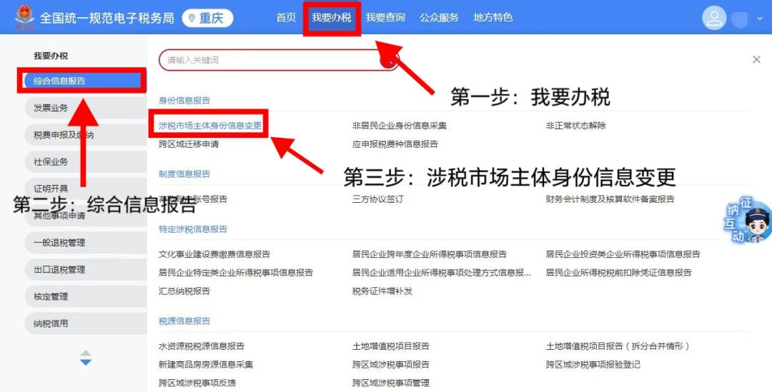 登陆重庆市电子税务局,依次点击【我要办税】-【综合信息报告】-【涉税市场主体身份信息变更】。