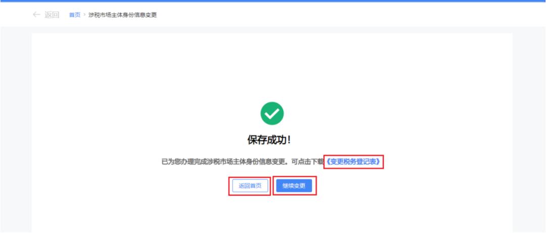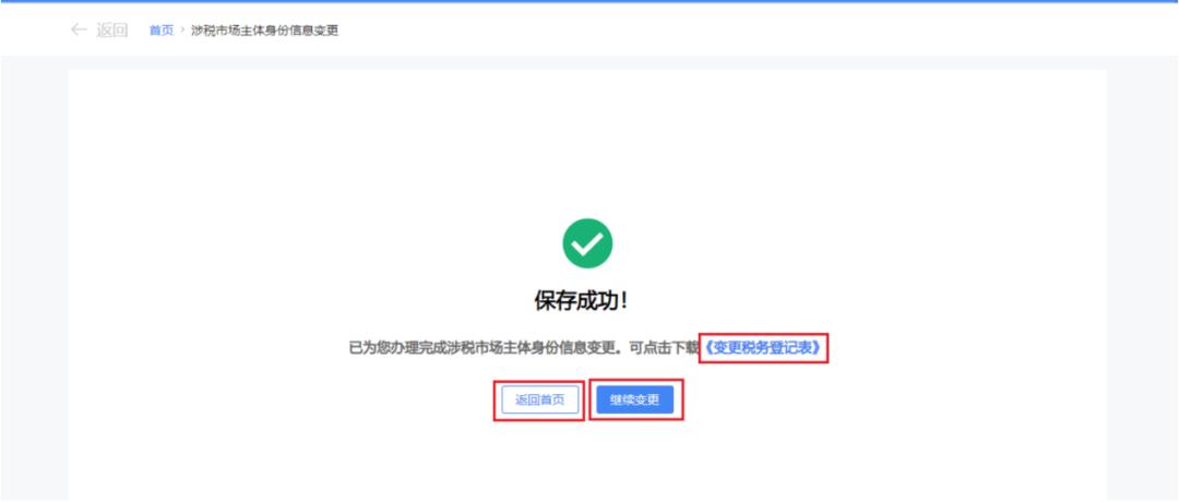 2.系统自动跳转到成功存储页面,并提示:“已经为您办理了涉税市场主体身份信息的变更。您可以立即下载《变更税务登记表》。点击【返回首页】返回首页;点击【继续变更】返回功能界面进行变更;点击【变更税务登记表】下载变更信息表。