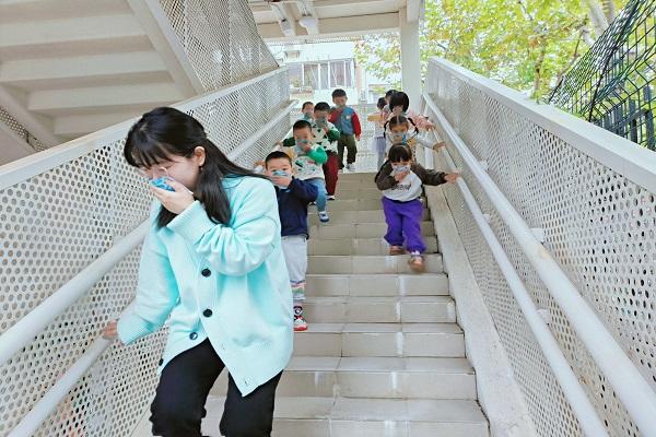 在同济大学幼儿园(虹口部),随着警报的突然响起,全园师生迅速响应,停止了手头的活动。根据消防安全计划,教师组织儿童用湿毛巾捂住口鼻,弯腰低头,有序撤离到指定位置。疏散后,老师仔细检查人数,看看有没有。 “负伤” 情况,并及时向安全负责人报告,整个过程分工明确,井然有序。