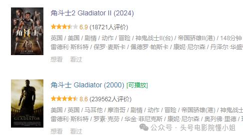然而,24 年后,已经 86 年长的雷德利导演 · 斯科特再次出手的《角斗士》 二是根本无法与自己的《角斗士》相提并论,豆瓣开分。 7.1 分数,现在成绩降到了 6.9 分。