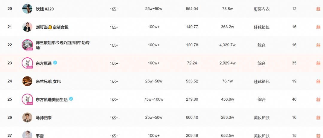 蝉妈妈数据显示,以带货销售额算,单飞的与辉同行一直占据着带货达人榜的前2名,多次登顶榜单第1。反观东方甄选,在今年2月,东方甄选在带货达人榜上排名前4,随后排名跌出前5,到了10月,东方甄选的排名跌到第23。
