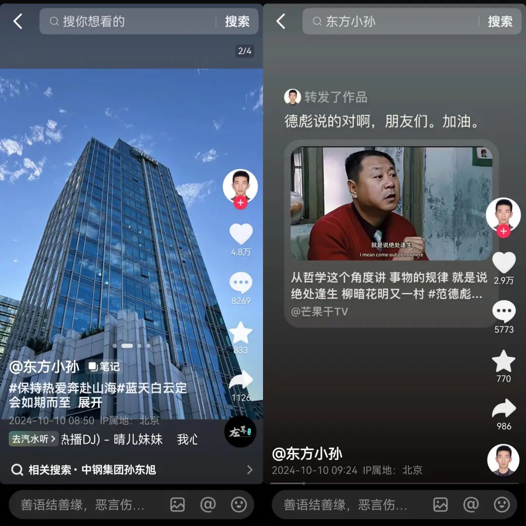今年10月10日,近9个月没有更新抖音账号的孙东旭,通过抖音图文晒出新东方总部大厦和中钢大厦,以及一张自己拿着帽子的照片。评论区中,众多东方甄选的粉丝表示“欢迎回归”。