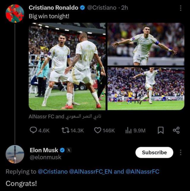 赛后,C 罗晒出了自己的庆祝照片,配文写道:“今晚的胜利!”令人惊讶的是,埃隆 - 马斯克居然回答说:“恭喜!”