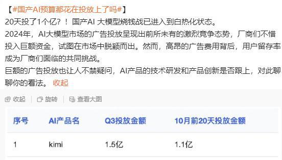但是从结果来看,这些尝试很难在短期内支撑公司的发展。而且造血能力不足 Kimi 然后改变策略,开始寻求成长。因此,有一个广告需要花费大量的预算来创新和保留。从最近的声明来看,杨植麟声称 Kimi 月活达到 3600 万 。这个数字似乎仍然让市场看到,AI 跑道尤其是 Kimi 对于当前因特网生态的颠覆。