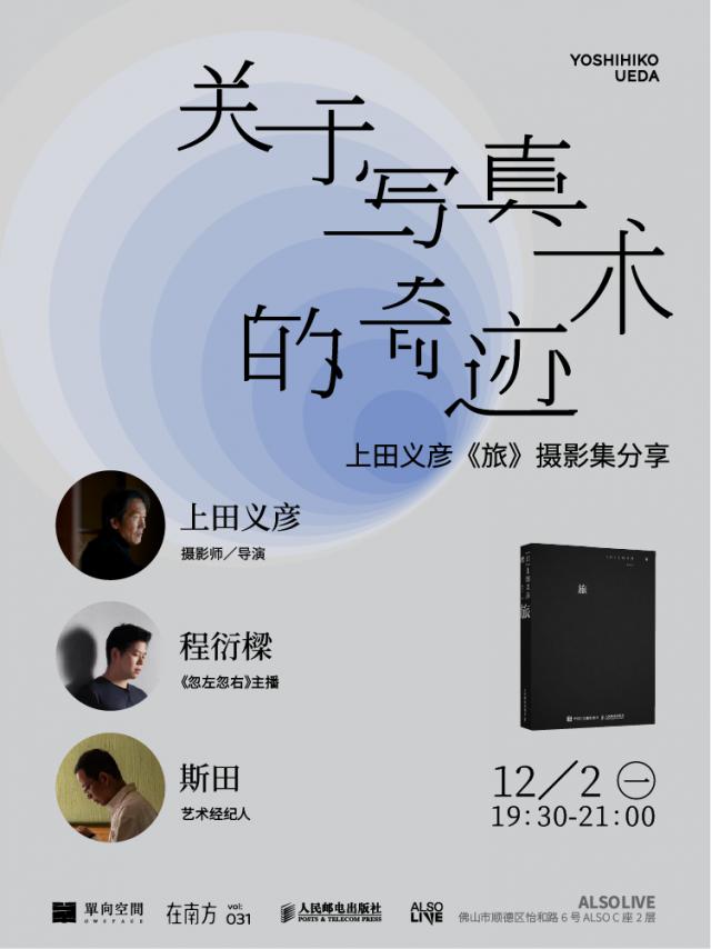 12 月 2 日(周一)19:30 - 21:00,上田义彦将携带摄影集《旅行》和「忽左忽右」主播程衍梁、艺术经纪人张斯田来到顺德 ALSOLIVE,谈谈在世界上行走和写真的奇迹。
