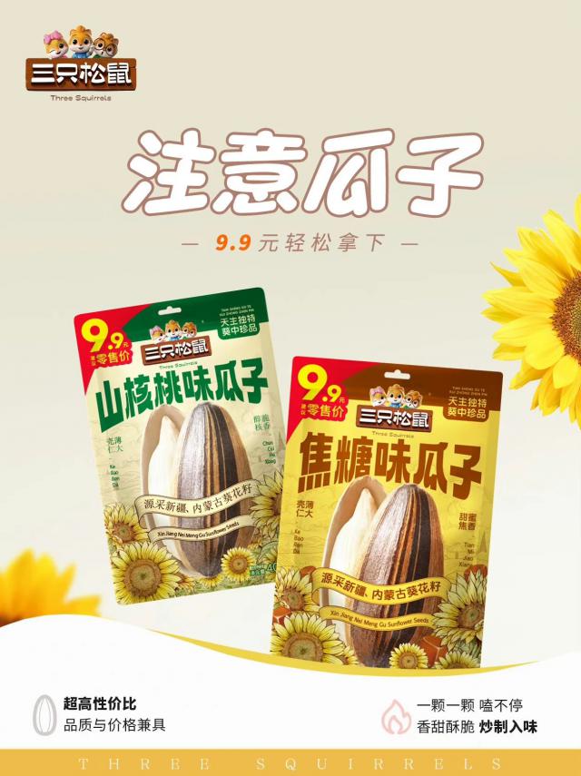 据报道,三只松鼠线下上线。 105 金钱产品,其中瓜子商品深受经销商欢迎,公司有词汇:注意瓜子。从那以后,团队就把这个“意外”放大,在瓜子之后推动花生产品,打造 9 块 9 专区。
