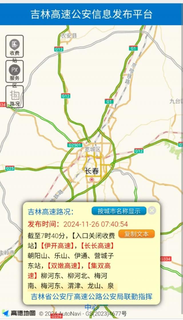 【伊开高速】、【长高速】朝阳山、乐山、伊通、营城子东站、【双嫩高速】、【双高速】柳河东、柳河北、梅河南、梅河东、渭津、龙山、泉太、林海、刘家馆子站、【白色高速】、【大广高速】、【沈吉高速】山城、大阳、东梅、一个营、磐石、明城站、【营东高速】、【铁科高速】长春北、开安、农安、农安北、哈拉海、王府、松原西、查干湖、大安、太山、安广、舍力、到保、白城东、青山、白城北、平安。 ( 珲乌高速 ) 、岭下站,因下雪入口关闭。 ;【长深高速公路】,因雾入口关闭。 ;【京哈高速】德惠、菜园、陶赖昭(榆树)、扶余,四平,梨树东,郭家店,公主岭,范家屯站,【辉临高速】,【通南高速】,【鹤大高速】雁鸣湖,通化西,大泉源站,因其它入口关闭。