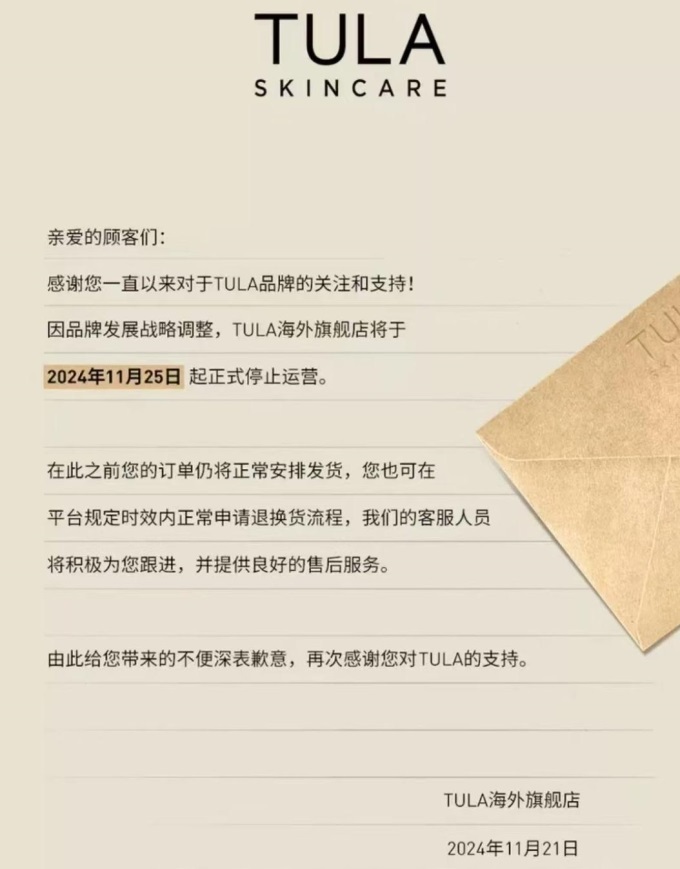 联商快讯:美国快消巨头宝洁于2022年收购的高端护肤品牌TULA天猫海外旗舰店于11月25日正式关闭。