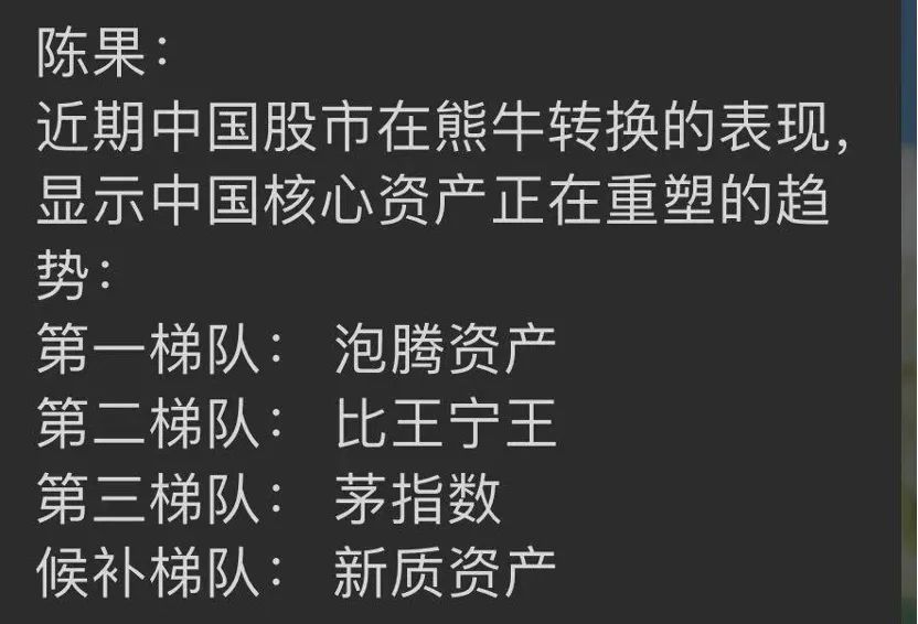 陈果早在10月初就提出了“泡腾资产”。他指出,“泡腾资产”代表了与老经济周期关联性低、具有国际运营能力、新消费服务、情感消费等领域的核心企业,并表示将是“中国核心资产第一梯队正在重塑”。