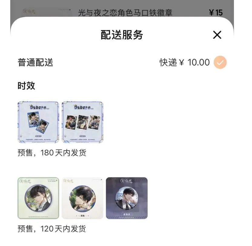 95后阿衡(化名)订购了马口铁勋章,这是《光与夜之恋》游戏的最新角色。这枚勋章虽然不贵,但是要等180天才能发货,也就是说半年后才能拿到实物。
