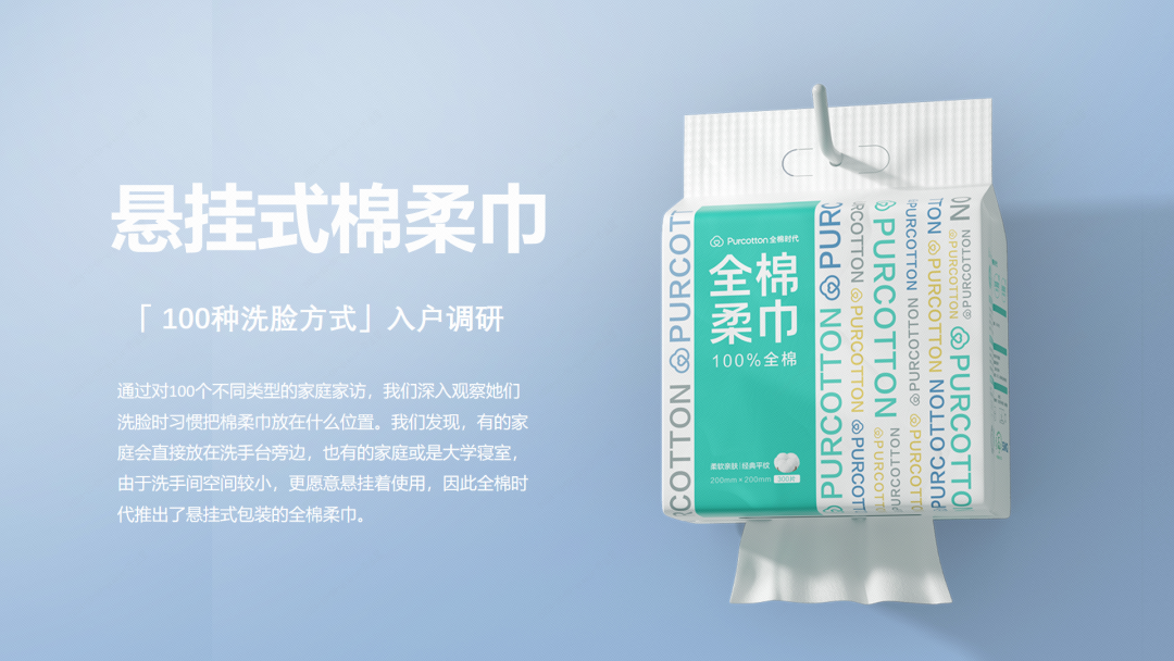 回来后,我们马上开始研发,看看怎样把棉柔巾变成悬挂式。虽然这只是一个小小的包装创新,但是一推向市场就爆炸了。