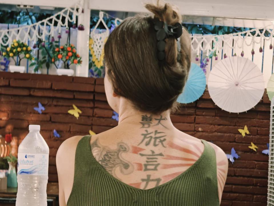 背后的外国背包客和中文纹身