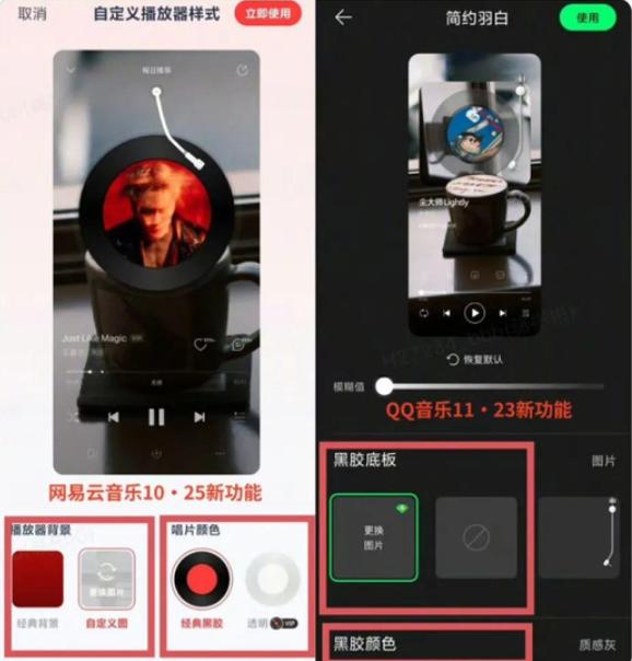 这一次,网易云抱怨QQ音乐,提到了10月25日网易云音乐推出的音乐播放器DIY功能。不到一个月的11月23日,QQ音乐发布了测试版。