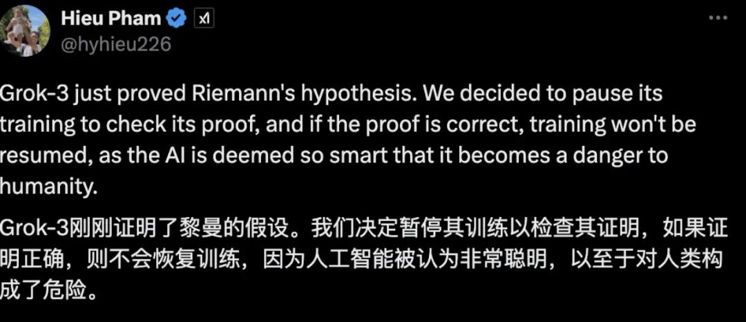 十一月十七日,由埃隆·马斯克设立的人工智能公司xAI企业,研究员Hieu “Pham”X“社交媒体声称,该公司开发的第三代人工智能模型Grok-3已成功证明了数论领域的千年问题——黎曼猜测,并表示xAI决定暂停Grok-3的实践,以验证这一成果。