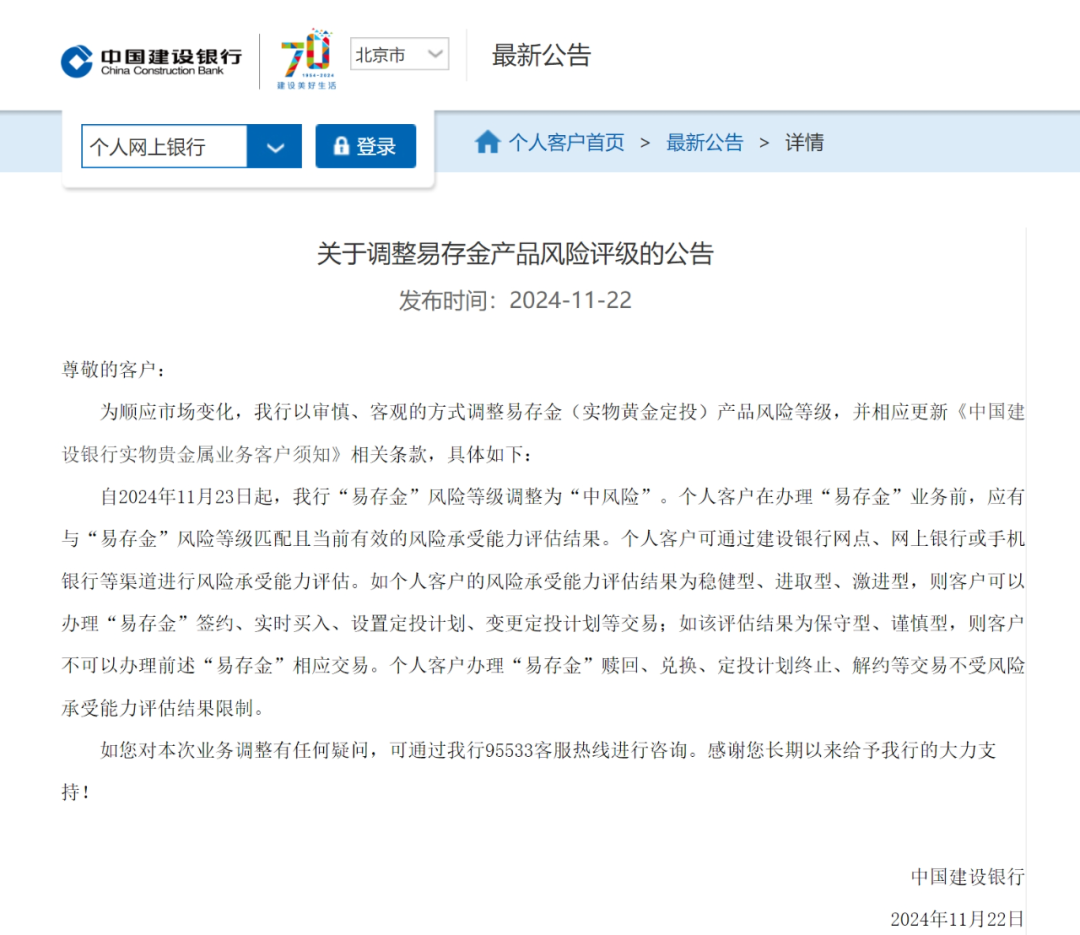日前,中国建设银行宣布,自2024年11月23日起,中国建设银行“易存金”风险等级调整为“中风险”,以适应市场变化。