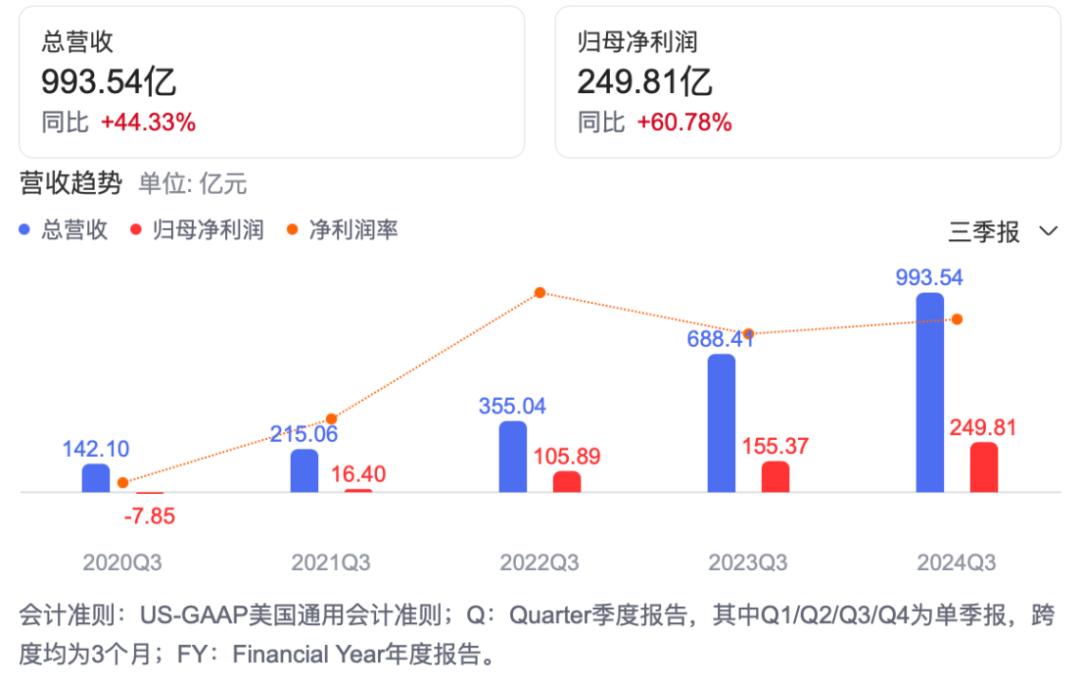 十一月二十一日,拼多多发布了2024年第三季度财务报告,截至9月30日。财务报告显示,2024年第三季度拼多多营收994亿元,同比增长44%,市场预计1028亿元,低于预期30多亿元。