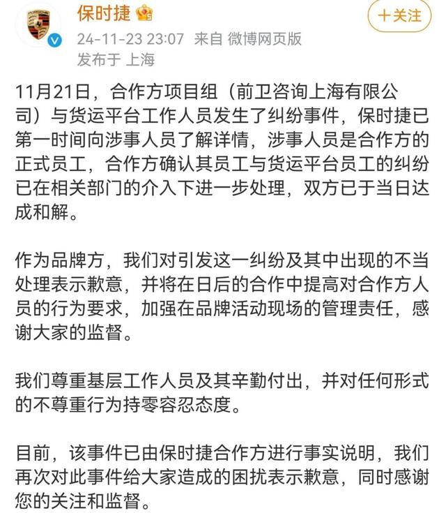 11 月 23 日本,一段“上海一货拉拉司机向保时捷工作人员维权”的视频引起了社交平台的关注。司机表示,保时捷工作人员拖欠。 600 人民币运费,还向平台投诉导致自己被封杀,视频中还疑似有推搡的场景。11 月 23 当天晚上,保时捷发表声明称,该公司对此次纠纷及其不当处理深表歉意,并发表了一份署名为新潮咨询上海有限公司的信息描述。