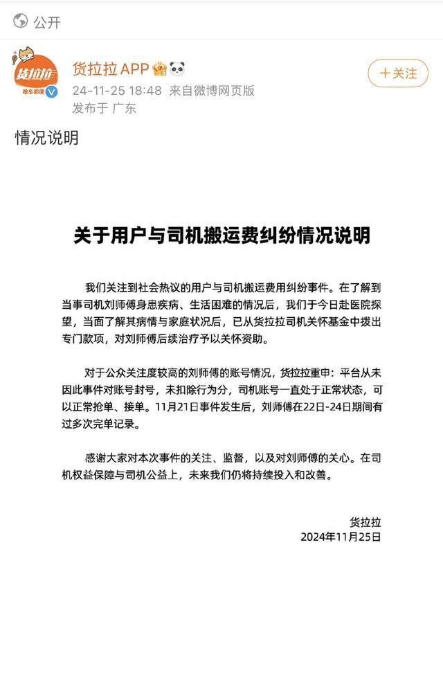 11 月 25 日本,货拉拉就客户与司机之间的运输费纠纷发表声明:我们关注客户与司机之间的运输费纠纷。得知司机刘师傅患有疾病和生活困难后,我们今天去了医院。在亲自了解了他的病情和家庭情况后,我们从货拉拉司机的护理基金中拨出了专项资金,对刘师傅的后续治疗给予了关怀和支持。