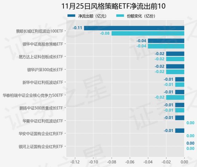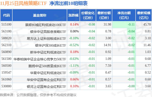 当天有 10 只风格策略 ETF 资金净流出基金,其中景顺长城红利低,净流出排名第一。 100ETF(515100)减少了份额 800.0 万份,净流出额为 1142.6 万元。