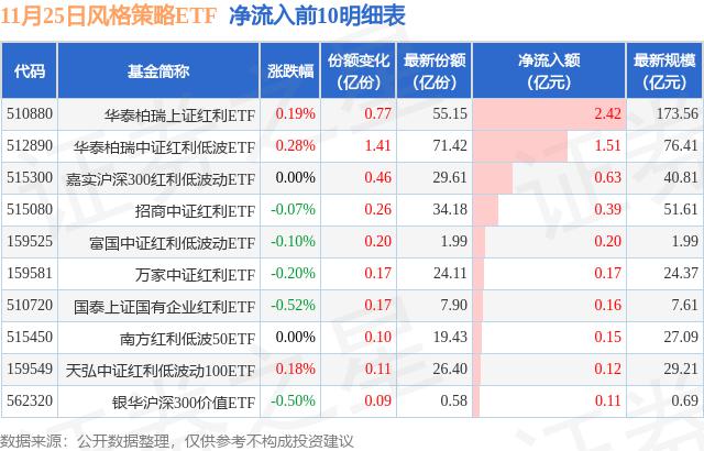 当天有 20 只风格策略 ETF 资金净流入显示,其中华泰柏瑞上交所净流入排名第一。 ETF(510880),份额增加 7700.0 万份,净流入额为 2.42 亿元。