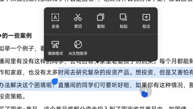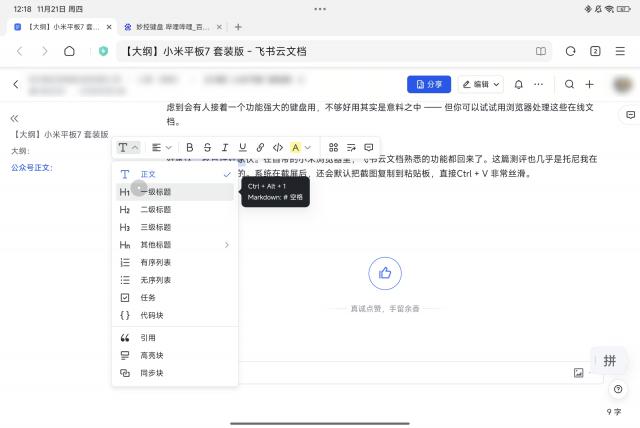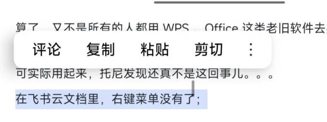在飞书云文档中,只有评论、粘贴、复制等功能出现在选段后,但电脑端方便的功能栏消失了。如果你想设置一个标题和字体风格,你必须去底栏。
