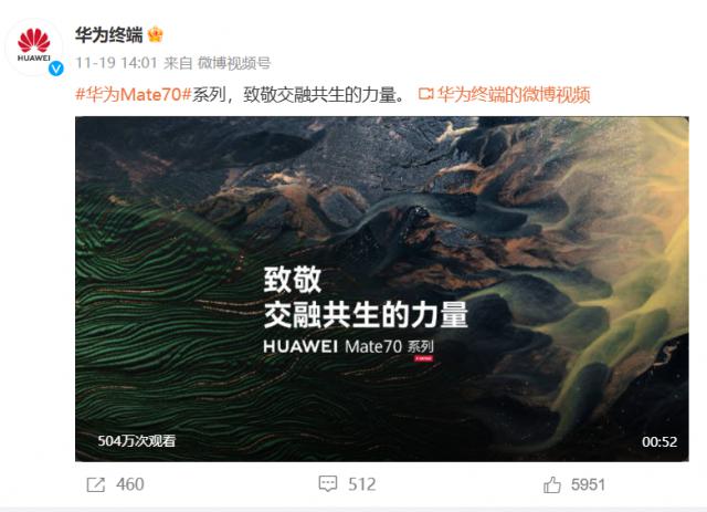 11 月 19 日,华为 Mate 70 全新品牌电影《致敬交融共生的力量》正式亮相。这部品牌电影以自然壮丽的场景和深刻的文化形象为主线,深刻诠释了华为通过“金银金”交织的画面。 Mate 70 设计灵魂和品牌核心系列。影片中,华为以自然为笔,以文化为墨,构建了一幅充满和谐美感的山河画轴,向大众传达了“交融共生”的核心理念。