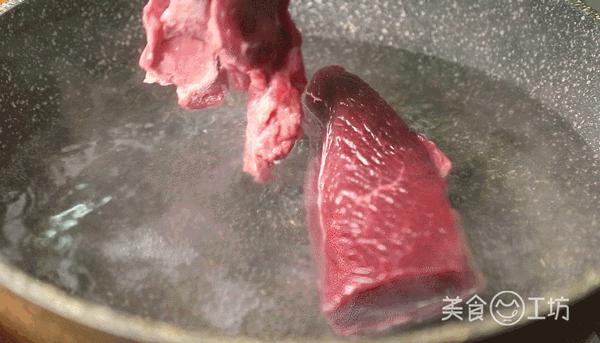 1. 将牛肉焯水取出血沫后捞出,沥干水分。