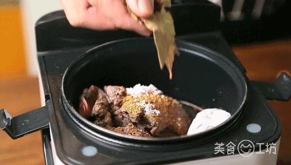 2. 将牛肉和各种调料一起排出水分,放入电饭煲中。