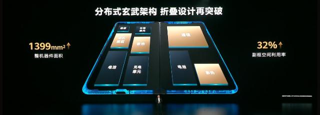 余承东说,Mate X6 选择分布式玄武架构,空间更大,性能更强。其中,整个机器部件面积增加 1399mm ²,提高副框架空间利用率 32%。与此同时,分布式结构完成了热原分离,具有超强的散热性能。Mate X6 分布式射频单元,灵犀天线较大,信号较强,其中天线长度增加 信号强度提高81% 60%。