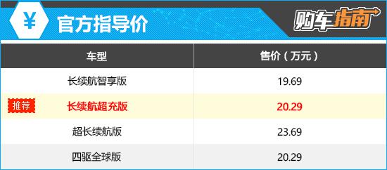 对售价来说是一样的 20.29 四驱全球版一万元,除了采用专属外观设计,标配车顶行李架外,其它配置与推荐车型完全一致。动力部分升级为双电机四轮驱动系统,确实能带来更强的加速性能,但相应的纯电续航里程更短,能耗更高。此外,它被用于入门级车型。 400V 结构,在补能速度方面也没有优势,所以不推荐。