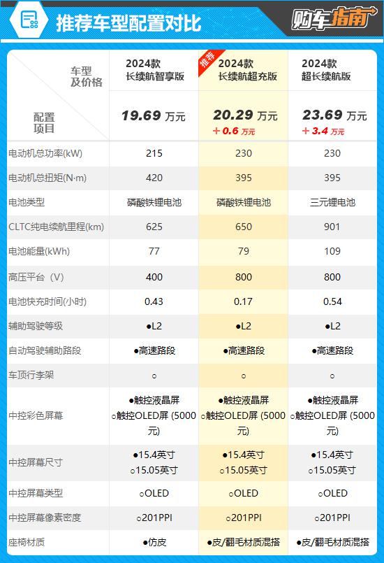 从整体配置和价格来看,编辑认为次低配车型长续航超充版更值得推荐。与入门版相比,推荐车型的性能基本相同,只是将座椅材料从仿皮升级为皮革。 / 翻毛材料混搭,提供更好的驾驶舒适性。更为重要的是,推荐车型的选择 800V 与入门版相比,平台建设在电池快充时间上有所缩短。 0.26 小时,补能更快,配合更长的纯电续航里程,可以大大提升日常用车体验,而价格只需要在入门版的基础上增加。 6000 元素,可谓物超所值。