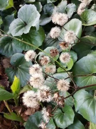 大吴风草的花朵非常符合大家印象中的“菊花”:黄色,多瓣,深秋开放。大量种植的大吴风草可以给黄澄澄一片花海,花期结束后,大吴风草会产生一系列带有“绒球”的水果序列,就像更大的蒲公英一样,非常新颖。从这个角度来看,大吴风草是一种兼顾观叶、赏花、观果的植物,非常全能。