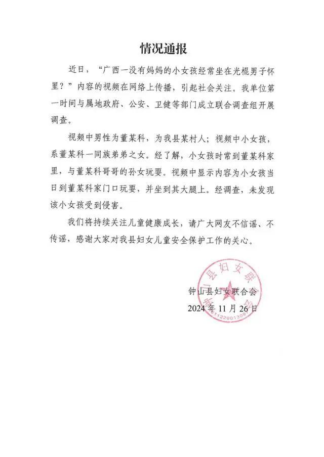 最近,“广西一个没有妈妈的小女孩经常坐在光棍男人的怀里。 ? “内容的视频在网上传播,引起了社会的关注。我单位立即与当地政府、公安、卫生健康等部门成立联合调查组进行调查。