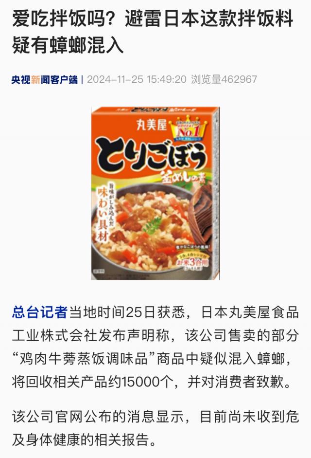 根据央视新闻报道,当地时间 25 日本丸美屋食品工业有限公司发表声明称,该公司销售的部分“鸡肉牛蒡蒸饭调味料”商品疑似混入蟑螂,将回收相关产品 15000 个,并且向客户道歉。