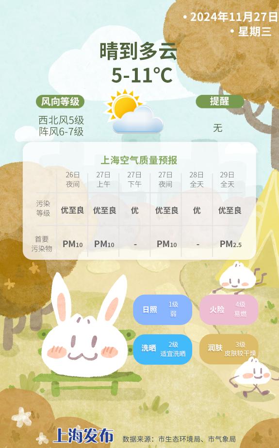 今日晴至多云,西北风5级阵风6~7级,早间叠加辐射降温影响,城区最低气温5℃,郊区2-3℃,一定要多穿一点,谨防感冒。预计白天最高气温11℃,体验寒冷。相对湿度80%~40%,火险等级气象指数:4级,易燃;空气干燥,注意补水保暖,同时注意用电用火的安全。