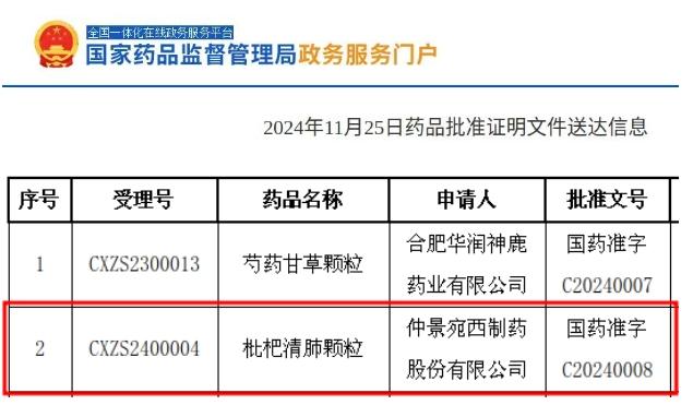 十一月二十五日,仲景宛西制药有限公司自主探索的枇杷清肺颗粒(国药准字C20240008)获国家美国食品药品监督管理局批准上市。这是河南首款经典名方中药复方制剂,也是省内首款3.1类中药,为中药经典名方新药研究注册探索了一条新途径。