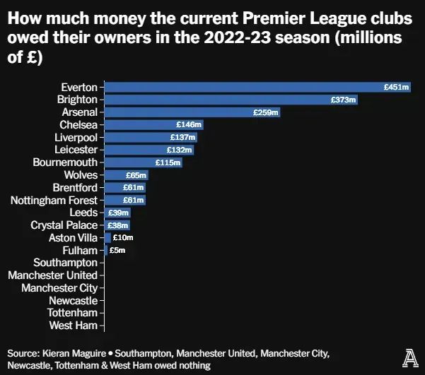 股东贷款一直是一个有争议的话题,尤其是在英超,埃弗顿、布莱顿、阿森纳等几家俱乐部都是贷款大户。据最新资料显示,埃弗顿以4.51亿英镑的免息贷款位居榜首,随后是布莱顿的3.73亿英镑和阿森纳的2.59亿英镑。如此高的股东贷款,不仅显示出俱乐部在财务上依赖个别股东的现状,而且更加深入外界对其财务健康的焦虑。