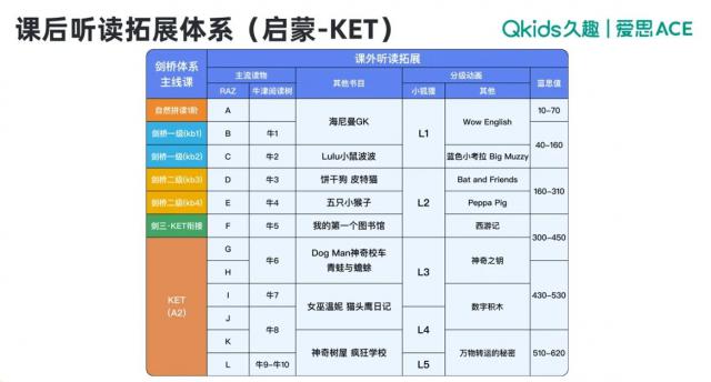 在正式开课之前,爱思有非常精确的课前定级测,帮助孩子锁定到精确的班级,能力划分很细致,比如 KET 根据娃娃的不同进展情况,可分为: