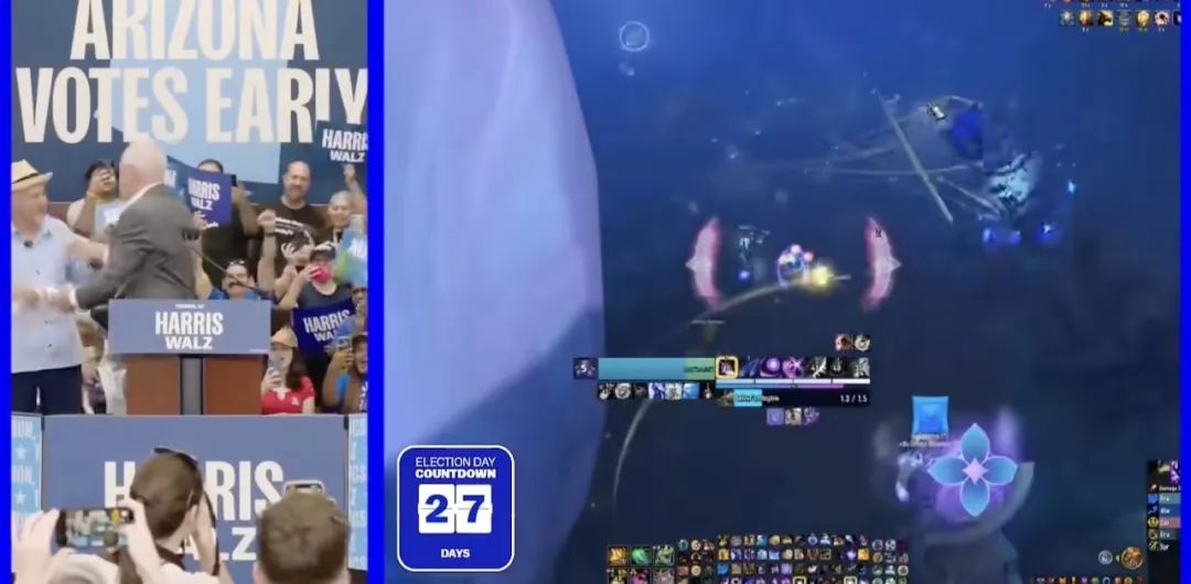 十月的一个晚上,总统候选人卡马拉·哈里斯的竞选队伍在Twitch平台上直播了《魔兽世界》。在哈里斯个人的Twitch频道中,蒂姆·沃尔兹-哈里斯当时的竞选伙伴——参加亚利桑那州的一次聚会,游戏主播Preheat在屏幕右侧即时玩魔兽世界的场景。五颜六色的技能效果不断闪烁,让人眼花缭乱,不知道视野该落在哪里。