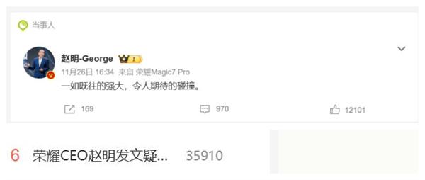 快科技 11 月 27 日消息,微博话题“荣誉” CEO 赵明发文疑似回应余承东“冲上热搜榜”,引起关注。