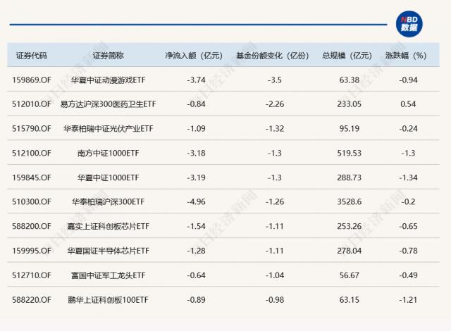 同时,华夏中证动漫游戏 ETF 基金认购的变化是 -3.5 一一一亿份,净流出额为 3.74 亿元;沪深易方达 300 医疗卫生 ETF 基金认购的变化是 -2.26 一一一亿份,净流出额为 0.84 亿元;华泰柏瑞中证光伏产业 ETF 基金认购的变化是 -1.32 一一一亿份,净流出额为 1.09 亿元。