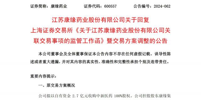 近日,江苏康源药业有限公司(以下简称“康源药业”)发布《关于回复上海证券交易所关于江苏康源药业有限公司关联交易的监管函》和调整交易计划的通知,宣布调整收购江苏中信药业有限公司(以下简称“中信药业”)的交易计划。本交易原计划由康缘药业自有资金进行。 2.7 高溢价收购其控股股东江苏康源集团有限公司(以下简称“康源集团”)生物药资产中新医药 100% 股份。