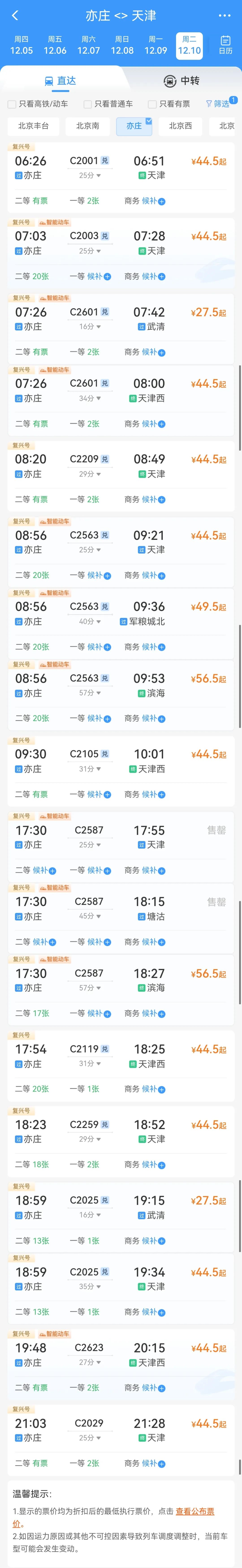 其中,开往北京的班次分别是C2608次、C2552次、C2002次、C2610次、C2558次、C2560次、C2018次、C2626次、C2628次、C2586次、C2632次、C2598次。从C2001次、C2003次、C2601次、C2209次、C2563次、C2105次、C2587次、C2119次、C2259次、C2025次、C2623次、C2029次等方面开往天津。从北京南站到亦庄站最快10分钟,从亦庄站到天津站最快25分钟。