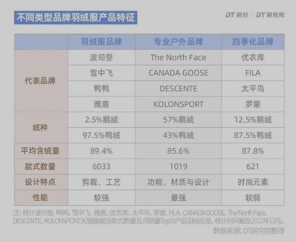 羽绒服产品不同类型品牌的特点 来源:DT财经