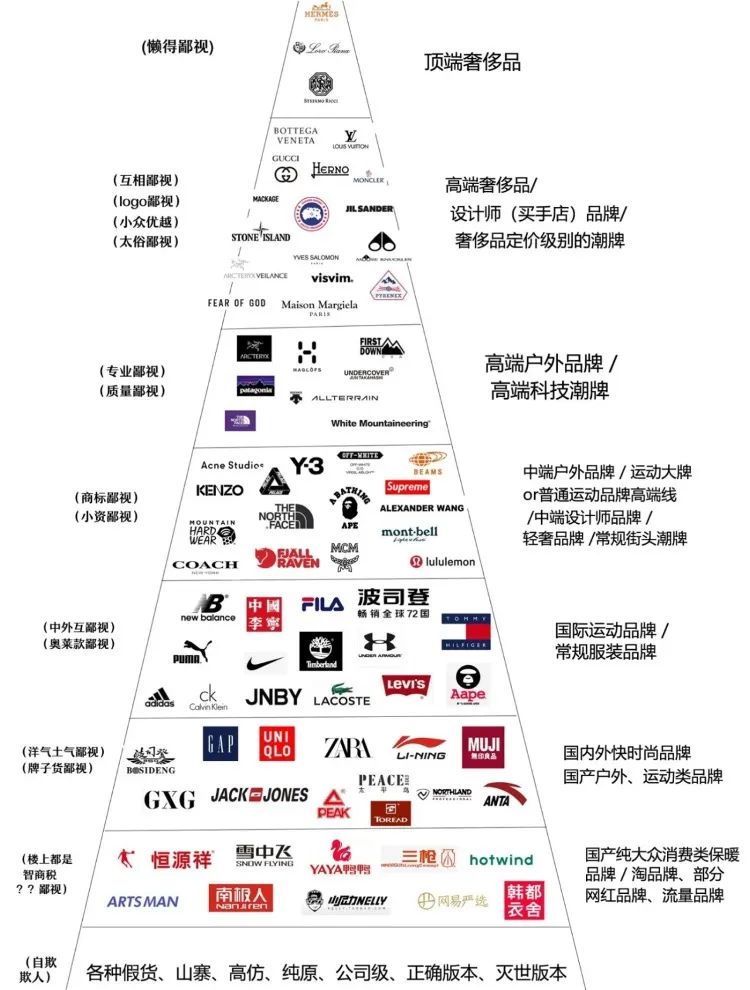 随着价格的不同,羽绒服品牌的鄙视链也存在。南极人、热风等国产品牌和流量品牌已经成为鄙视链的底部,而国内外运动、快消品牌李宁、优衣库、耐克、阿迪达斯等。位于中端,而高端品牌更多的是奢侈品品牌。