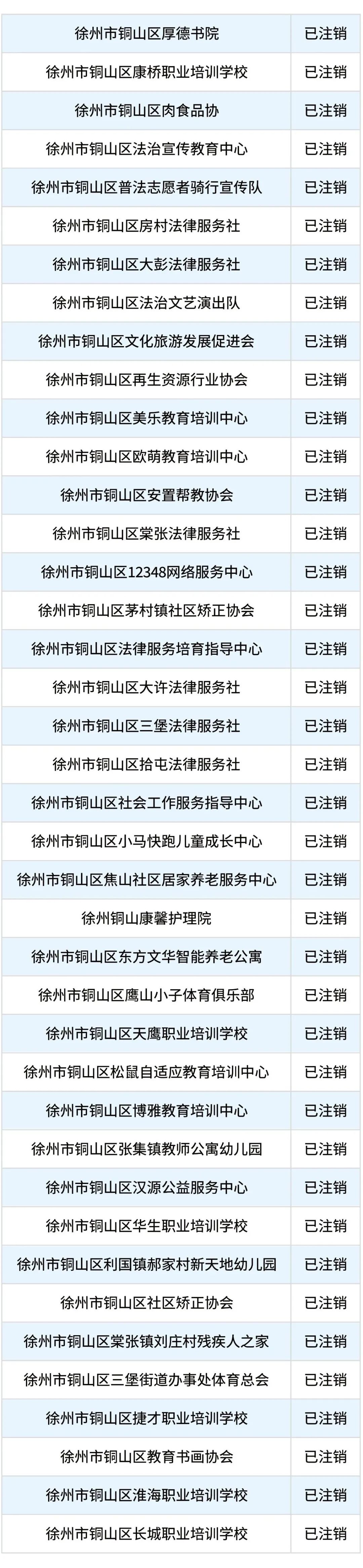 经铜山区民政局及相关业务主管部门批准,根据《社会团体登记管理条例》和《民办非企业单位登记管理暂行条例》的有关规定,以下社会团体符合注销登记条件,现决定注销徐州市铜山区厚德书院等40个社会团体,并向社会各界公布。