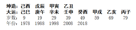 起大运年:8岁 11个月 24天,每个交大运年, 4月 2日起运(阳历)。