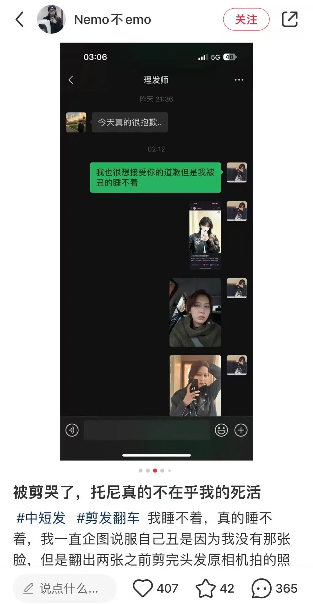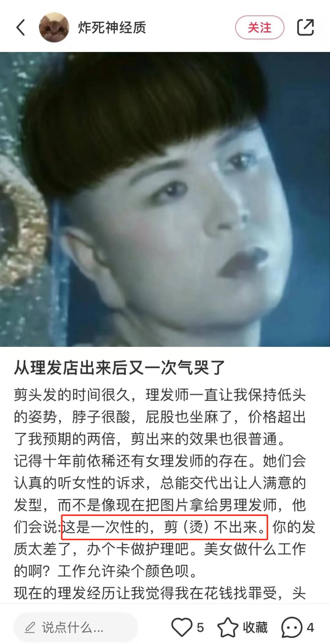 即使你愿意说,也有很多美发师不愿听,他们按着你的肩膀,主要推一句“我不想让你觉得,我想让我觉得”。