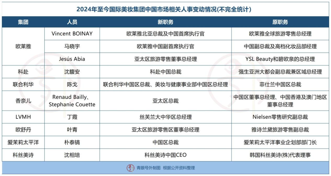 同时,国际美容巨头对华战略的调整也体现在人事调动上。据青眼号以外的不完全统计,自2024年以来,至少出现了10名涉及中国市场的国际美容集团高管。其中涉及“一把手”7个岗位,占比超过一半。此外,还有两个工作涉及旅游零售市场。