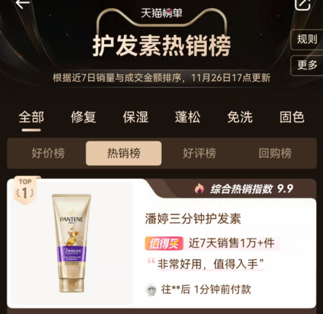 值得注意的是,发现潘婷不仅在Tiktok平台上表现出色,在天猫平台上也表现出色。潘婷三分钟奇迹护发乳在天猫护发素畅销榜上排名第一,潘婷的其他洗发水、护发精油、护发乳等产品也在不同的榜单上。此外,今年双十一潘婷在天猫预售的第一天也排名第一。